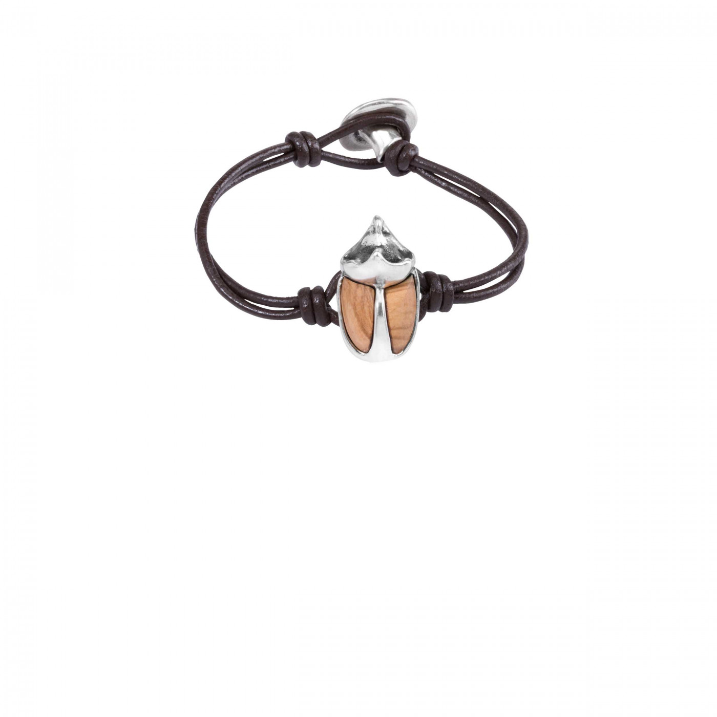 Pulsera de cordón doble de cuero con una imaginativa joya con forma de escarabajo en el centro, diseñada en metal con baño de plata y madera de olivo satinada. Una pulsera diferente y de espíritu naturalista, que ha sido diseñada y hecha a mano en España en su totalidad por UNOde50.