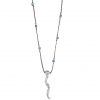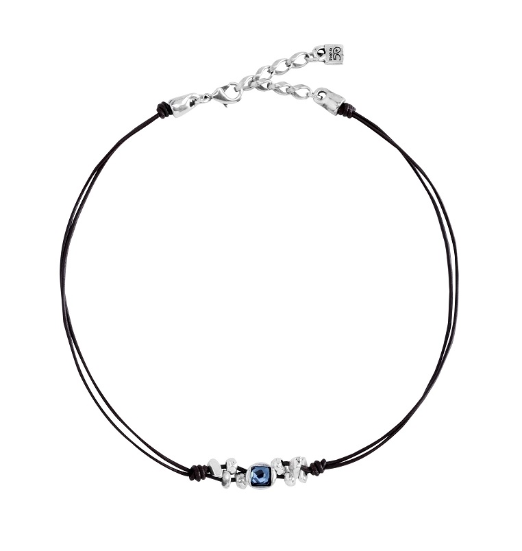Colgante de cuero con piezas de metal bañadas en plata e incrustación de cristal de SWAROVSKI® ELEMENTS de color azul en el centro. La cadena del cierre permite ajustar la largura del colgante y finaliza con el candado característico de la firma. Una joya elegante y atemporal que refleja el espíritu urbano de UNOde50. Hecho 100 % a mano en España.