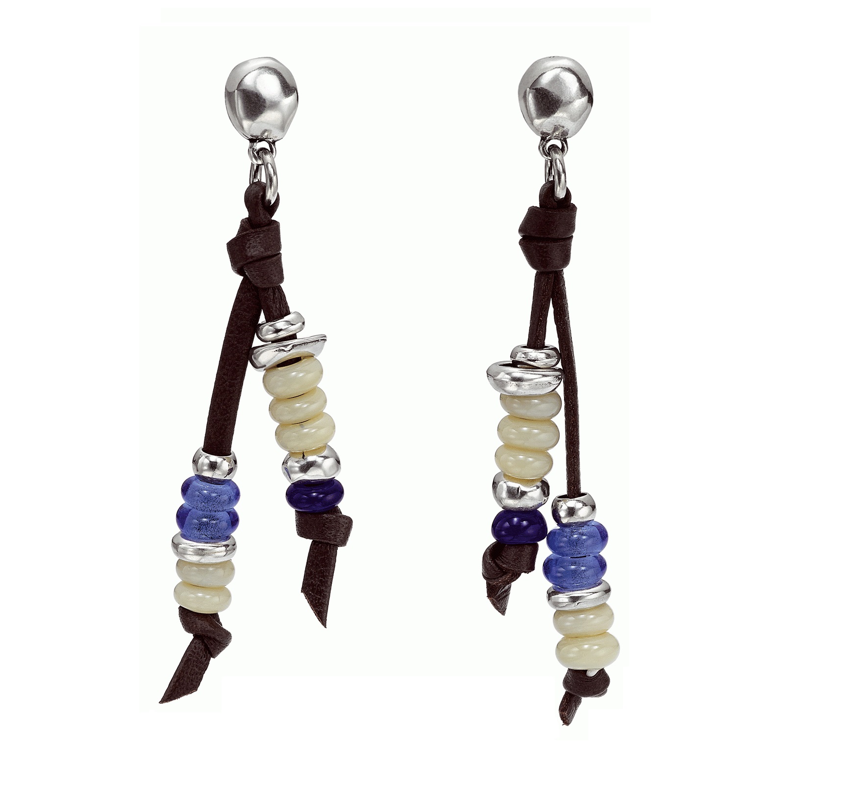 Pendientes Uno de 50 con cordones de cuero marrón, metal bañado en plata y cristales color azul. Los pendientes de nombre “Lollapalooza” con referencia PEN0468 tienen pulsera a juego y se envían con estuche oficial de la marca.