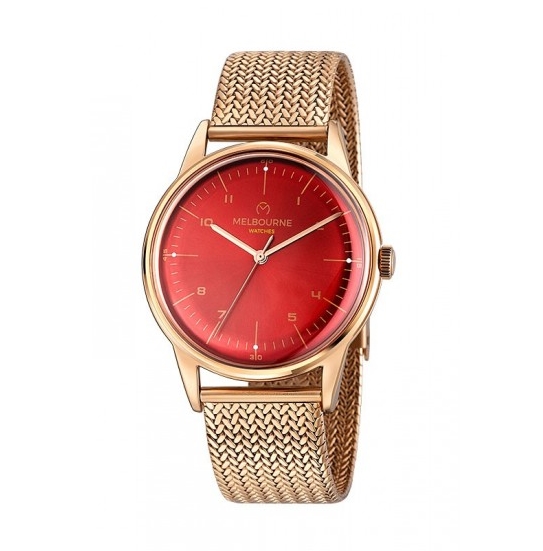 Este Sherbrooke destaca por su exclusividad y luminosidad gracias a su diseño dorado rosé en caja y correa, donde esta esfera roja con indicadores rosé aporta el toque original.
