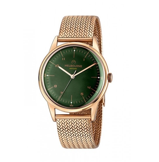 Este Sherbrooke destaca por su exclusividad y luminosidad gracias a su diseño dorado rosé en caja y correa, donde esta esfera verde con indicadores rosé aporta el toque original.
