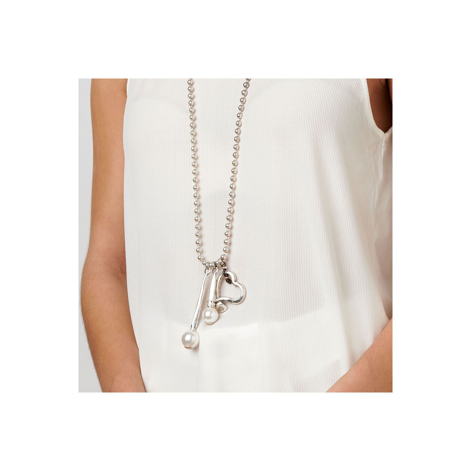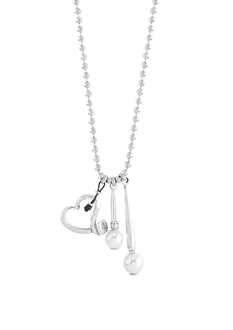 Sugerente collar largo de mujer en metal bañado en plata, cuya cadena de pequeñas cuentas se embellece con un charm en forma de corazón, y dos más acabados con perlas sintéticas de color blanco. Una creación dinámica y muy fresca que rememora la esencia clásica de la casa. Una joya hecha en España 100% a mano, con un diseño único e inconfundible de UNOde50.