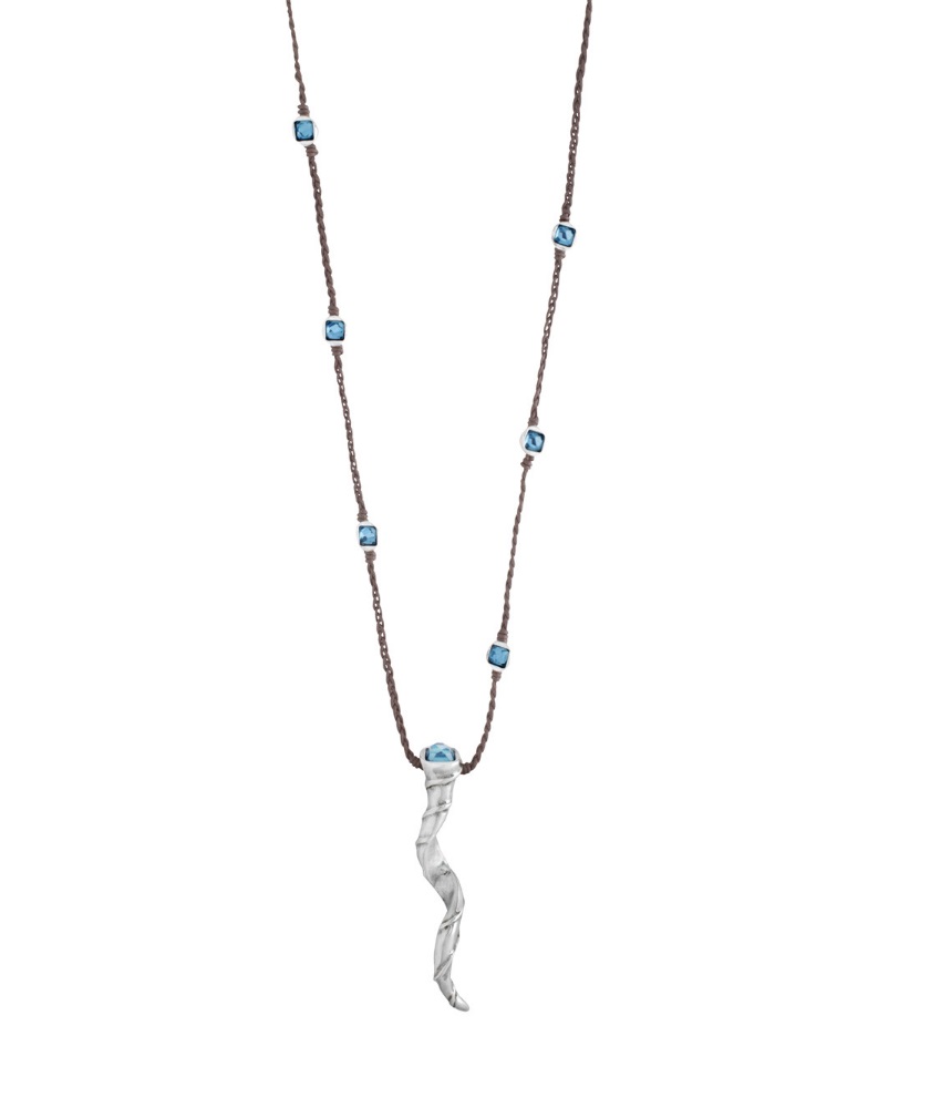 Collar largo de metal bañado en plata con un original colgante de formas redondeadas y en espiral, que representa el cuerno del antílope kudu. La incrustación de cristal azul de SWAROVSKI® ELEMENTS en el colgante aporta la elegancia atrevida y el estilo único de la firma. Una joya atemporal de estilo boho hecha a mano en España por UNOde50.